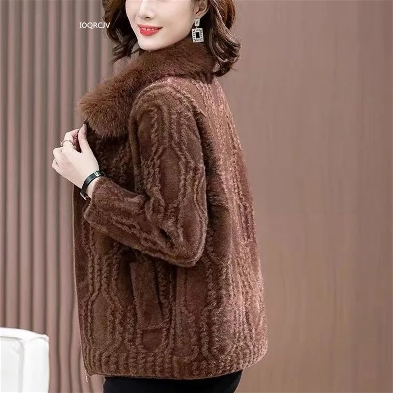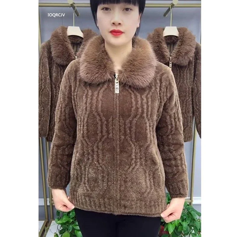 Women Knitted Cardigan Thicken Large Size Imitation Mink Velvet Sweater Coat Middle-Aged Mother Fur Collar Zipper Knit Jacket