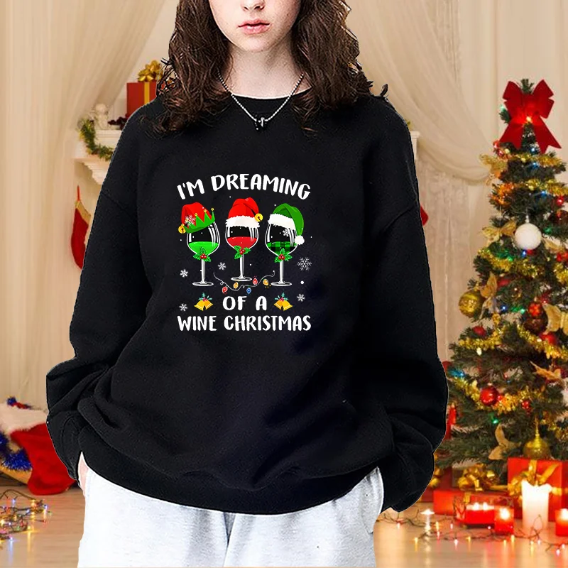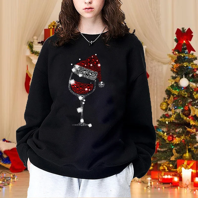 Women's Fashion Christmas Red Wine Glasses Round Neck Pullover Christmas Casual Loose Sweater Red Wine Glasses Top